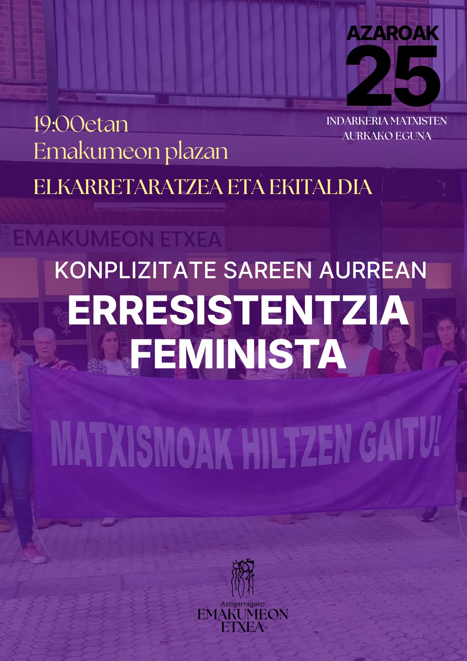 19:00 “Konplizitate sareen aurrean erresistentzia feminista” lemapean elkarretaratzea eginfo dugu Emakumeon plazan. Eta ondoren ekitaldia izango dugu.